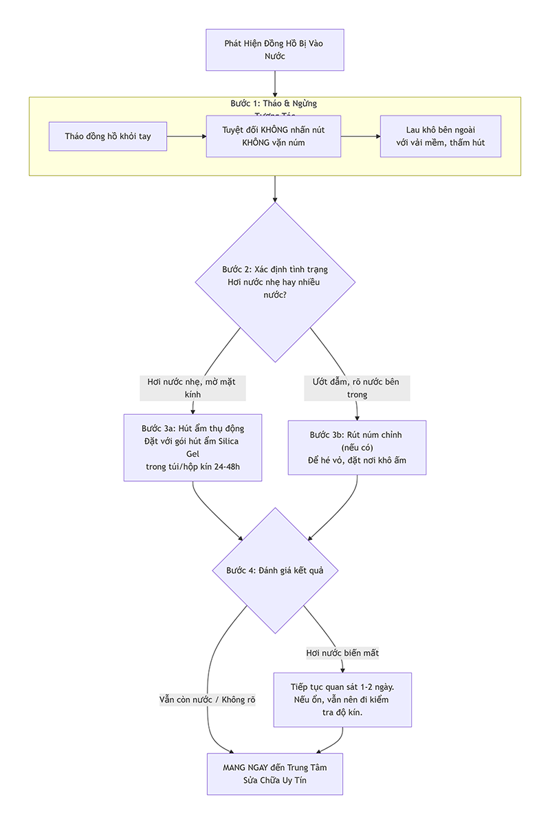 Ngay khi phát hiện đồng hồ có nước hoặc hơi nước, hãy ngay lập tức thực hiện tuần tự các bước sau đây. Đừng hoảng sợ, sự bình tĩnh và hành động chính xác là chìa khóa.