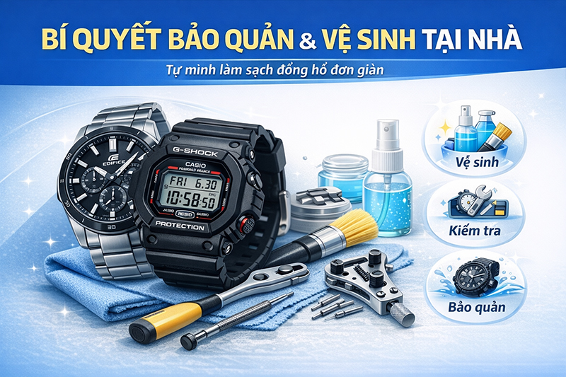Vệ Sinh Đúng Cách Việc vệ sinh đúng cách giúp đồng hồ sạch sẽ và hạn chế hư hỏng. Người dùng có thể tham khảo cách vệ sinh đồng hồ Casio tại nhà để thực hiện an toàn với các lỗi nhẹ.
