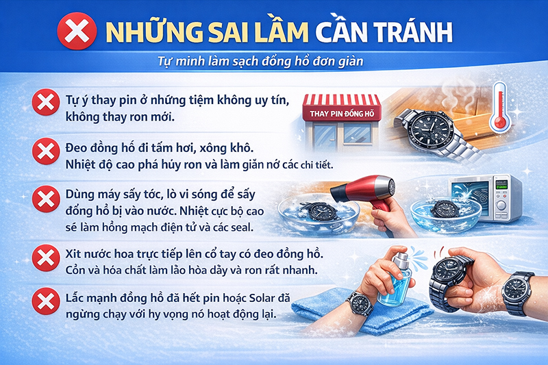 ❌ Dùng máy sấy tóc, lò vi sóng để sấy đồng hồ bị vào nước. Nhiệt cục bộ cao sẽ làm hỏng mạch điện tử và các seal.