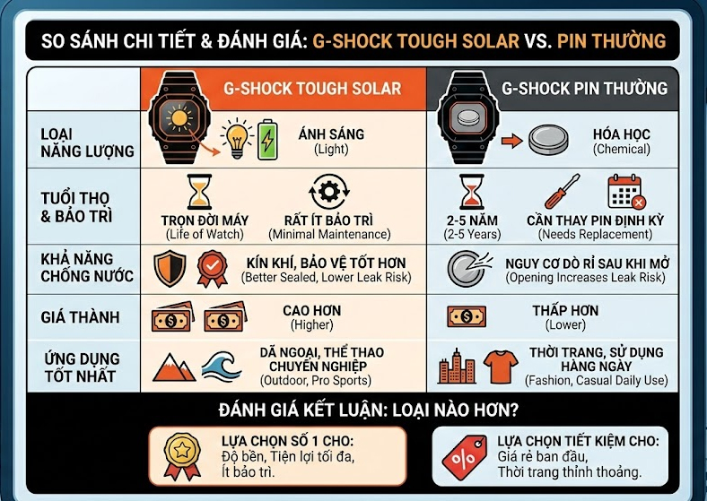 Khi mua G-Shock, một trong những câu hỏi lớn nhất là nên chọn dòng pin thường hay dòng năng lượng mặt trời Tough Solar. Mỗi loại đều có những ưu nhược điểm riêng về chi phí, tuổi thọ, độ tiện lợi và tác động đến môi trường.
