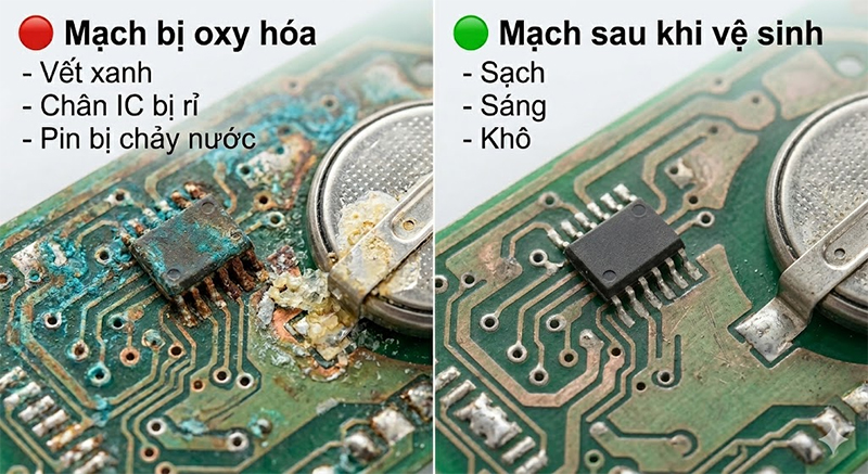 Vệ sinh bằng cồn chuyên dụng và máy siêu âm để loại bỏ nước, cặn bẩn và oxy hóa