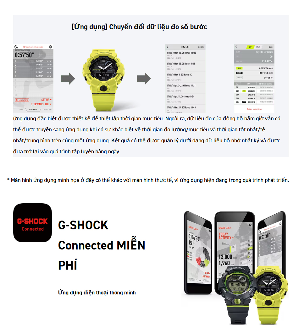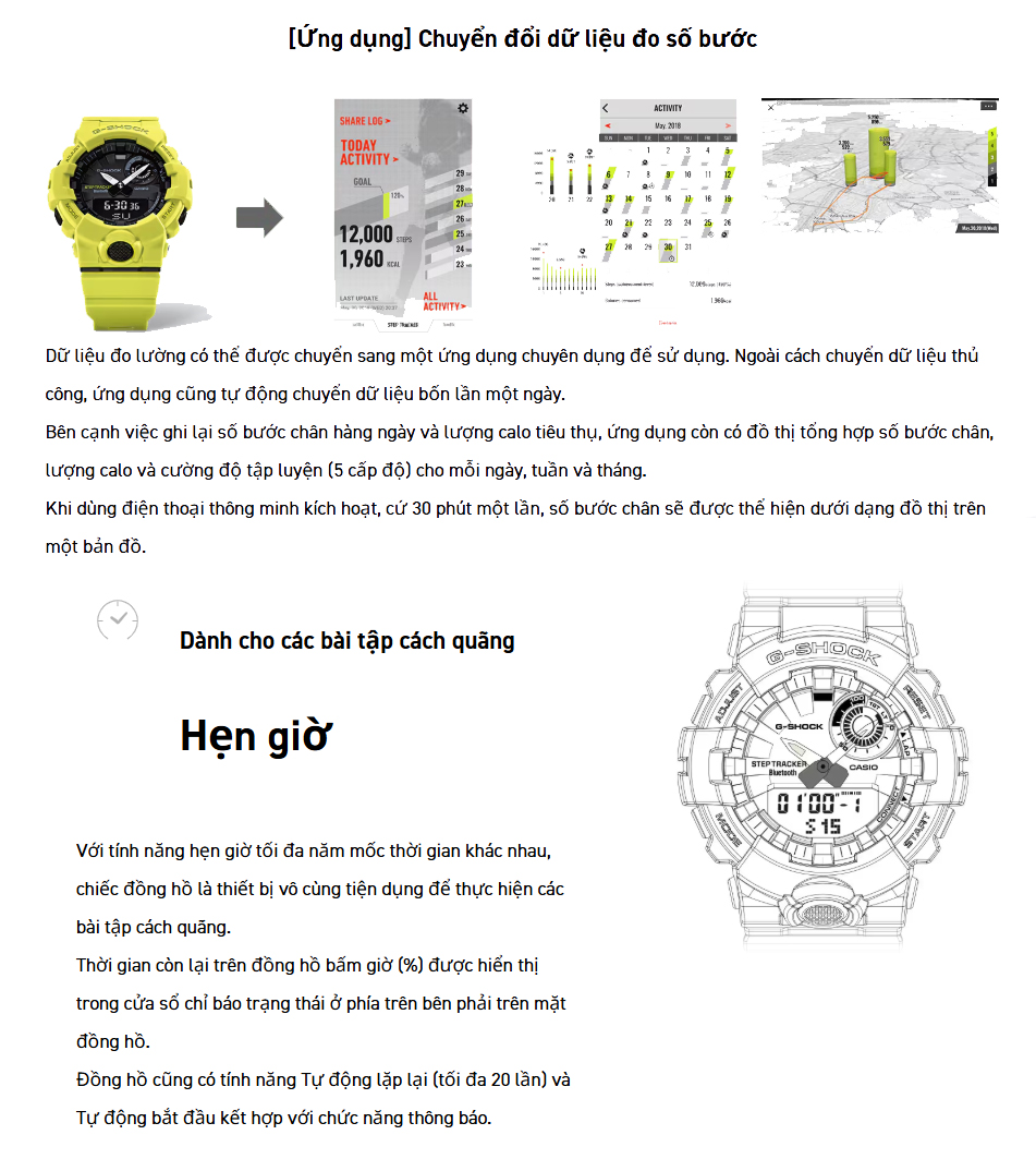 Điểm nổi bật của GBA-800 là khả năng kết nối Bluetooth với điện thoại thông minh, cho phép đồng bộ thời gian chính xác và theo dõi các hoạt động thể thao qua ứng dụng Casio Watches. Đồng hồ được trang bị các cảm biến đo bước chân, tính toán quãng đường và calo tiêu thụ, giúp người dùng dễ dàng quản lý sức khỏe hàng ngày.
