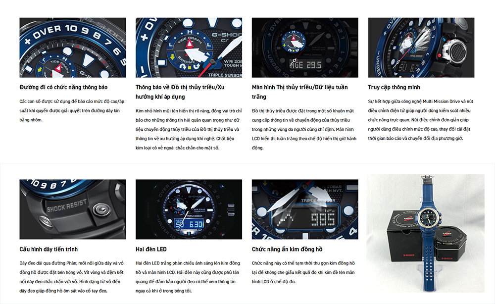 Gulfmaster GWN-1000 là dòng G-Shock cao cấp được thiết kế đặc biệt cho môi trường biển và các hoạt động trên biển. Với khả năng chống nước 200m, tích hợp cảm biến thủy triều, pha trăng và la bàn, Gulfmaster là người bạn đồng hành tin cậy của các thủy thủ, ngư dân và những người yêu thích các hoạt động trên biển.