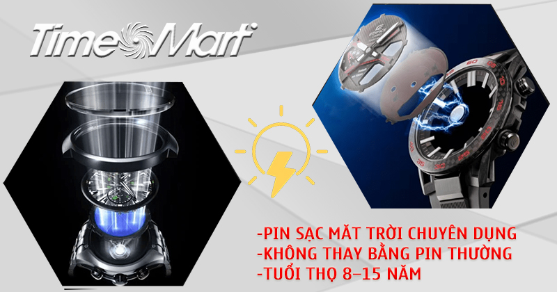 | Nguyên lý hoạt động | Tấm pin mặt trời trên mặt đồng hồ chuyển đổi độ sáng thành năng lượng, sạc vào pin sạc bên trong |